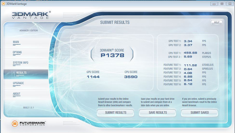 | 3DMark Vantage P Result | 1378 Punkte | |