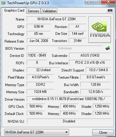 Für echte Spieler ist die Nvidia Geforce GT 220M keine geeignete Grafiklösung. Zwar kommt derselbe Grafikchip wie in der deutlich leistungsstärkeren GT 240M zum Einsatz (G96M), jedoch sind die Ergebnisse der 3D-Benchmarks auf Grund einer niedrigeren Taktung deutlich geringer. Lediglich 4.010 Punkte ermittelt der 3DMark06 nach wiederholter Ausführung. Die GT 220M-GPU ist nicht grundsätzlich so langsam, doch Asus taktet die als MXM-Modul gesteckte GPU deutlich herunter. 500, 400, 1.250 Mhz, das sind die Taktungen von Kern, Speicher und Shader. In anderen Einsatz-Notebooks, wie dem Asus X64VG, läuft dieselbe GT-220M-GPU mit 550, 500, 1.350 MHz (Kern, Speicher, Shader), was bei gleichem Prozessor zirka 5.300 3DMarks06 möglich macht.
