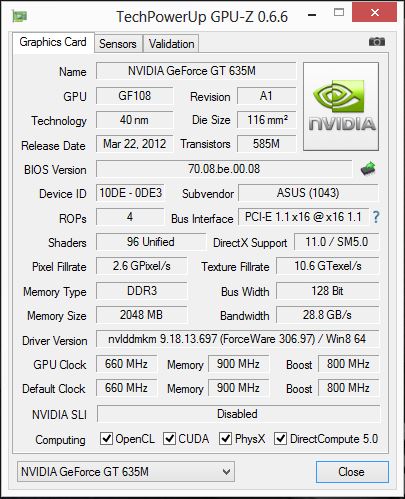 Die integrierte Intel HD Graphics 4000-GPU und der separate Nvidia GeForce GT 635M-Grafikchip sind für die Grafikausgabe zuständig. Der GeForce Chip gehört der Mittelklasse an und unterstützt DirectX 11. Der GPU stehen 2 GB Speicher zu Verfügung. Seine maximale Arbeitsgeschwindigkeit im K75VJ liegt bei 661,5 MHz. Der integrierte Grafikkern von Intel unterstützt ebenfalls DirectX 11. Die Arbeitsgeschwindigkeit des Chips liegt zwischen 350 MHz und 1.150 MHz.