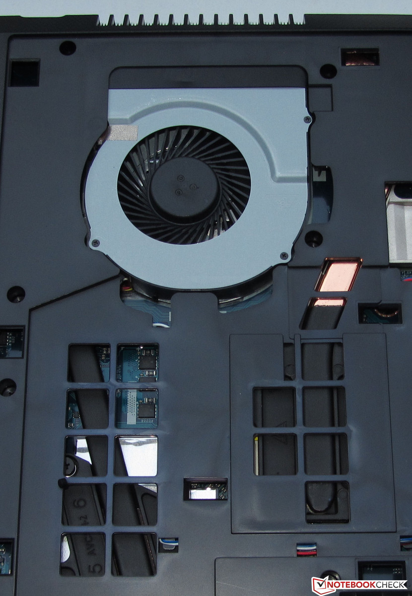Die Wartungsklappe auf der Unterseite gibt den Zugang zum Arbeitsspeicher, zur Festplatte und zum WLAN-Modul frei. Auf den Lüfter hat man eingeschränkten Zugriff und es besteht die Möglichkeit, diesen zu reinigen. Die zwei Arbeitsspeicherbänke unseres Testmodells sind bereits belegt (6 GB). Das Notebook kann bis auf 8 GB aufgerüstet werden. Ein Tausch der Festplatte wäre auch kein großer Aufwand. Einfach die Halteschrauben lösen und die Platte herausziehen. Neben der Festplatte befindet sich noch ein zweiter Festplattensteckplatz. Somit könnte man das Gerät mit zwei Festplatten ausrüsten: Eine schnelle SSD für das Betriebssystem, eine herkömmliche Festplatte für die Daten. Leider liegt kein zweiter Festplattenkäfig bei.