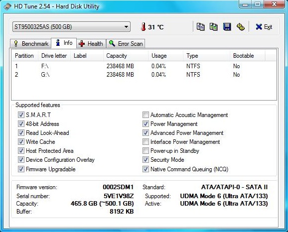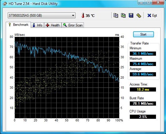 Nur eine Partition war, zumindest bei unserem Testgerät wegen einer versteckten Partition, mit 221 GByte etwas kleiner. Die Festplatten erhielten im Vista Leistungsindex eine Wertung von 5.6. Da dieser Index aber insgesamt wenig aussagekräftig ist, haben wir die Festplatten noch von HD Tune überprüfen lassen, um genauere Ergebnisse zu erhalten. Dort lag die minimale Übertragungsrate der Betriebssystem-Partition bei 36,1 MB/Sek, die maximale bei 75.5 MB/Sek und die durchschnittliche Übertragungsrate bei ordentlichen 59.6 MB/Sek. Die Zugriffsrate lag bei 18.2 und die Durchsatzrate bei 78 MB/Sek.