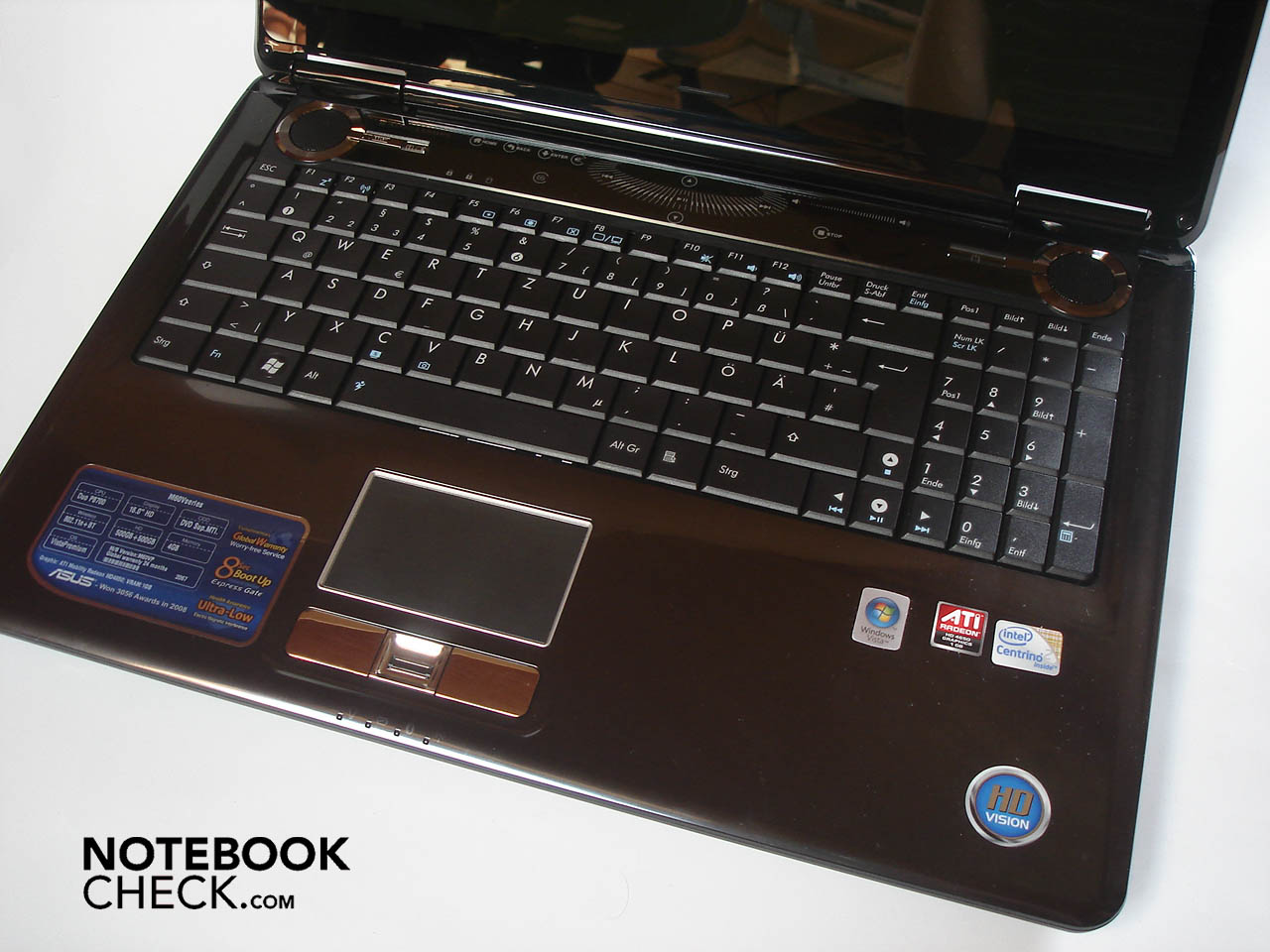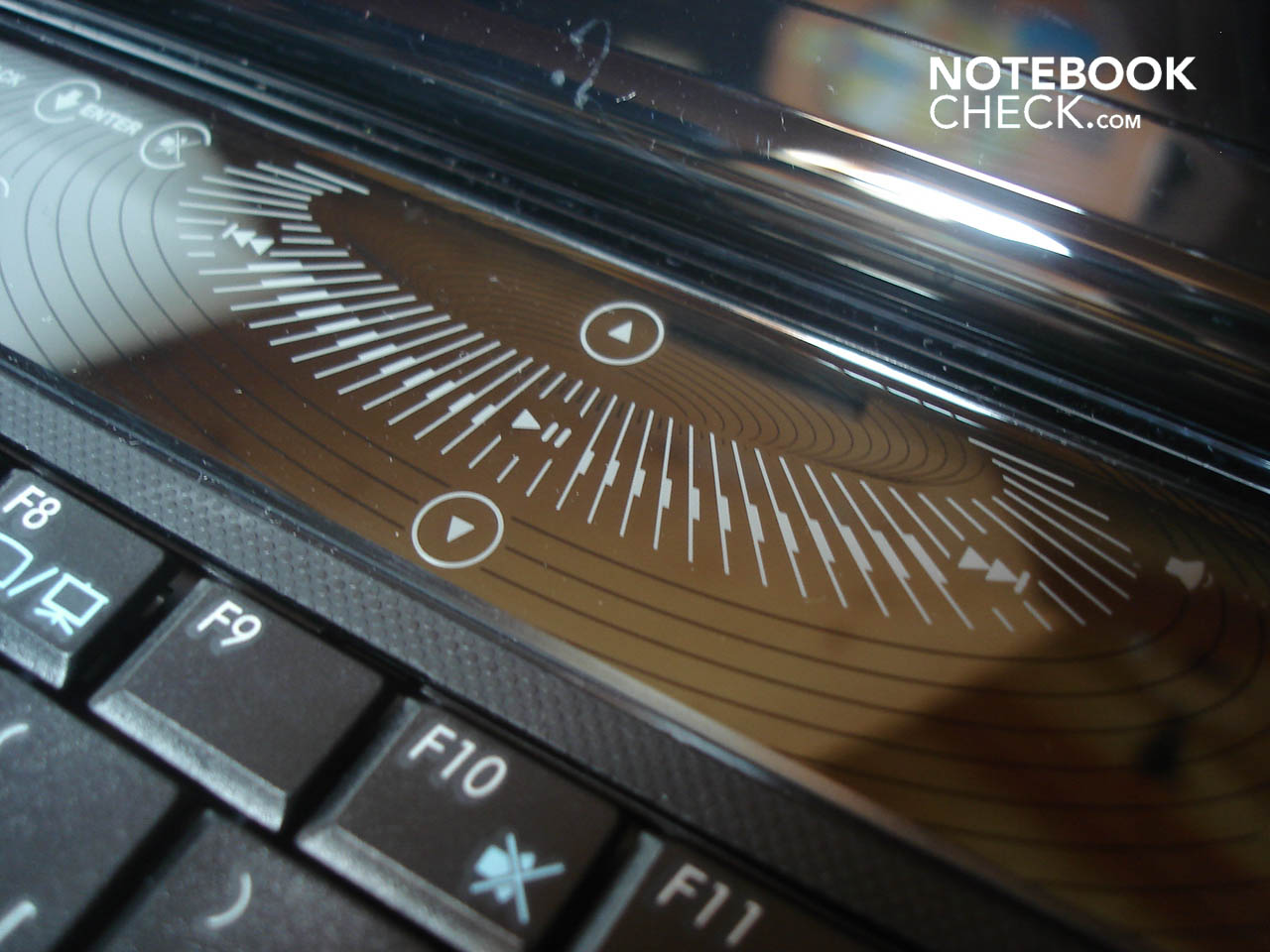 Oberhalb der Tastatur hat Asus eine stylische und berührungsempfindliche Leiste integriert, die mit blauer Beleuchtung und zahlreichen Funktionen aufwartet. So erwarten den Nutzer neben der Lautstärken-Regelung und Mulimedia-Funktionen wie „Stop“, „Play/Pause“, „Vorschalten“ und „Zürückschalten“ eine auf Media Center optimierte Bedienung. Damit kann in den Menüs nach links und rechts beziehungsweise oben und unten durchgeschaltet werden. Zudem warten Schaltflächen für „Zurück“, „Weiter“ und „Home“. Schade: Die diversen Schaltflächen sind recht klein geraten, obwohl durchaus genügend Platz zur Verfügung gestanden wäre.