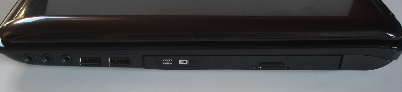 Auf der rechten Seite befinden sich drei Sound-Anschlüsse (Line-In, Mikrofon, Kopfhörer), die leider nicht farblich gekennzeichnet sind. Zudem hätten wir uns einen Line-Out Ausgang gewünscht, damit man nicht ständig zwischen Kopfhörer und externen Lautsprechern umstecken muss. Neben den Sound-Anschlüssen befinden sich auf der rechten Seite noch zwei USB 2.0 Ports und ein 8x Multinorm DVD-Brenner.