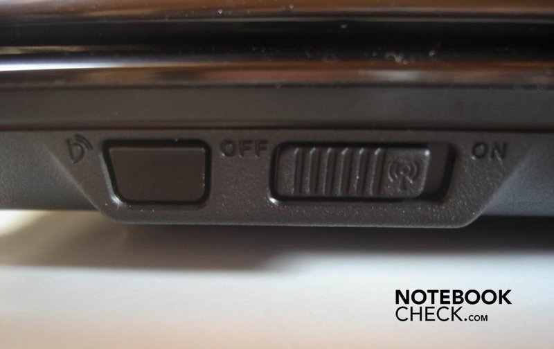 Auf der Vorderseite befindet sich hingegen ein Schieberegler, der sowohl Bluetooth (v.2.1) als auch das Wlan (802.11 a/b/g/n) gleichzeitig aktiviert. So ist man gezwungen eine bestimmte Tastenkombination auf der Tastatur auslösen, um Wlan und Bluetooth getrennt voneinander zu aktivieren oder auszuschalten.