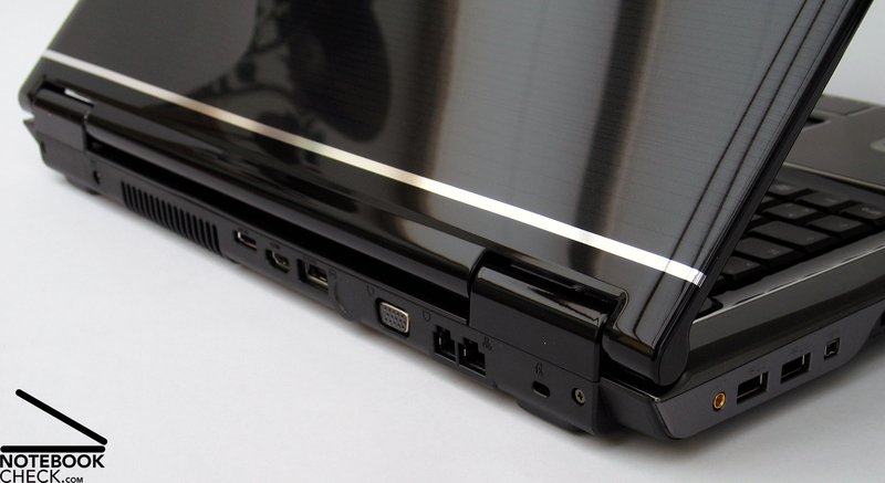 Die Rückseite des Laptops steht wie bereits erwähnt ganz im Zeichen von meist dauerhaft belegten Anschlüssen, wie etwa dem Netzanschluss. Neben der Auslassöffnung für den Systemlüfter bietet das Notebook eine AV-In Buchse, über welche mittels des im Lieferumfang enthaltenen Adapters, Audio und Videosignale in das System gespeist werden können. Auch ein volldigitaler HDMI Port, etwa zum Anschluss eines großformatigen und hochauflösenden Monitors darf beim Asus M70S nicht fehlen. Um das Notebook auch mit einer externen Festplatte bei bestmöglichen Übertragungsdaten verbinden zu können, wurde das M70S auch mit einem eSATA Anschluss ausgestattet. Der analoge Standard-VGA-Port ergänzt das Angebot an Videoschnittstellen. Letztlich findet man an der Rückseite auch noch jeweils eine Buchse zum Anschluss des Notebooks via LAN und Modem sowie einen Kensington Port.