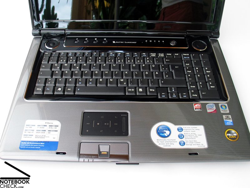Das Touchpad liegt mittig unter der Tastatur, etwas dezentral im Gehäuse. Auffallend ist vor allem, dass das Pad vergleichsweise tief im Gehäuse eingelassen ist, und man daher beim Steuern des Mauszeigers ständig mit dem Finger an der umliegenden Kante anstößt. Sehr angenehm fällt die Oberfläche des Pads aus, die optimale Gleiteigenschaften bietet. Neben einem optisch gekennzeichneten Scrollbereich bietet das Touchpad außerdem auch noch eine Dual-Mode Funktion. Durch einen Fingertipp auf die Beschriftung „Mode“ werden am Pad einzelne Symbole beleuchtet und dadurch hervorgehoben. In diesem Betriebszustand ist es nun möglich, mit dem Touchpad auch Multimediafunktion zu steuern oder aber die Lautstärke der Soundwiedergabe zu regeln.