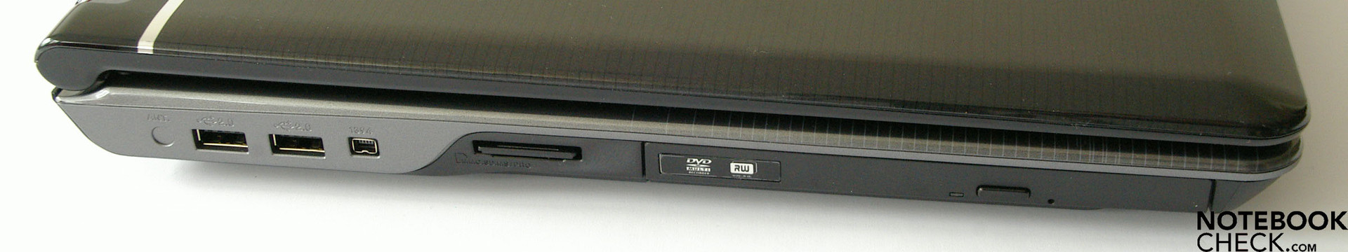 Im Detail bietet das Asus M70V an der linke Seitenkante zwei USB 2.0 Ports, einen Firewire Anschluss, einen Cardreader sowie im vorderen Bereich das optische Laufwerk.