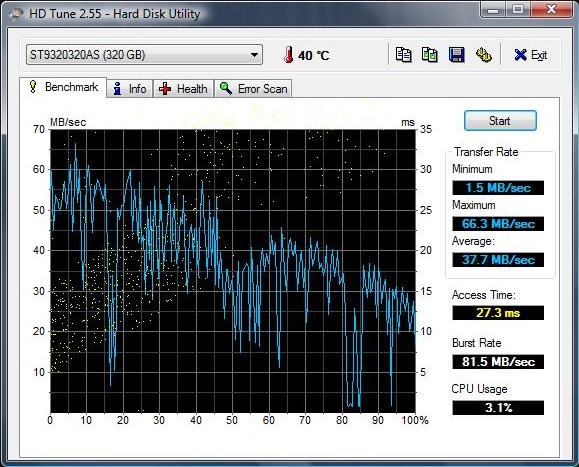 Als Massenspeicher dient eine 320 GByte fassende Festplatte von Seagate mit 5400 U/min. Deren Werte haben wir mit dem Tool HDTune ermittelt. So beträgt die minimale Übertragungsrate 31.7 MB/sek, die durchschnittliche 51.8 MB/sek und die maximale 69.4 MB/sek, insgesamt ordentliche Werte. Die Zugriffszeit von 22.3 ms fällt hingegen eher unterdurchschnittlich aus. Für den normalen Arbeitsalltag ist die gebotene Leistung aber völlig ausreichend.