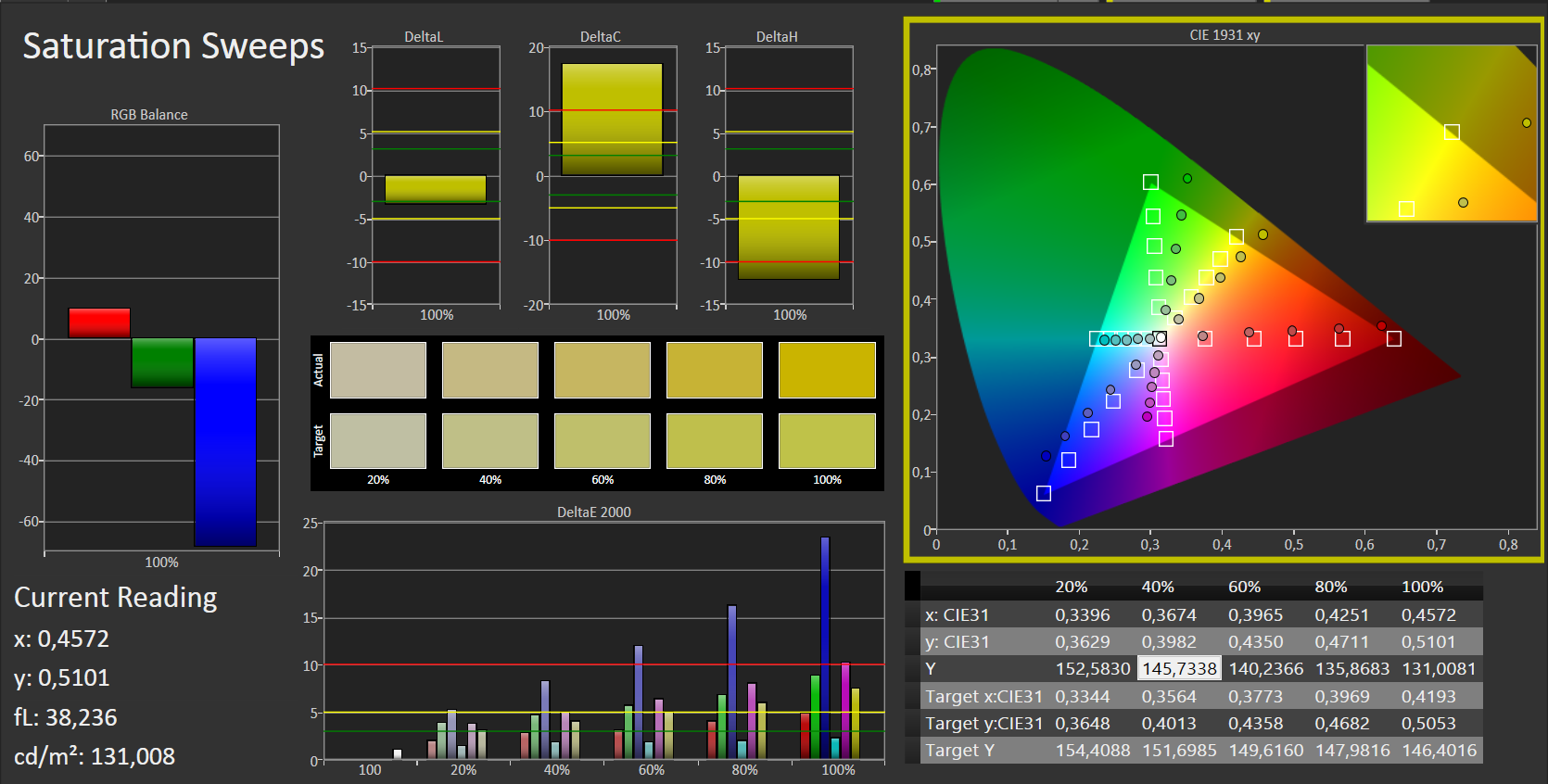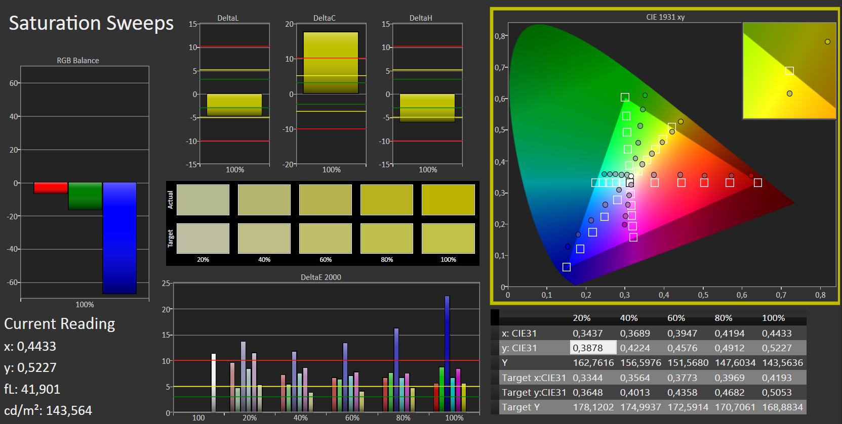Im Auslieferungszustand haben wir den Bildschirm wie üblich vermessen (Zielfarbraum sRGB). Die DeltaE-2000-Abweichungen der meisten Farben liegen leicht außerhalb des Zielbereiches (DeltaE 3). Die Grau- und Blautöne zeigen stärkere Abweichungen. Einen Blaustich weist der Bildschirm nicht auf, im Gegenteil, die Grauwerte verfälschen leicht in den warmen Bereich. Diese Unstimmigkeit konnten wir jedoch mit einer Kalibrierung beseitigen (Fotospektrometer), wonach sich die DeltaE (Graustufen 1, Farben 3,7) deutlich verbesserten. Die Farben liegen nach Kalibrierung fast alle im Zielbereich, d. h. sie entsprechen exakt dem sRGB-Farbraum.