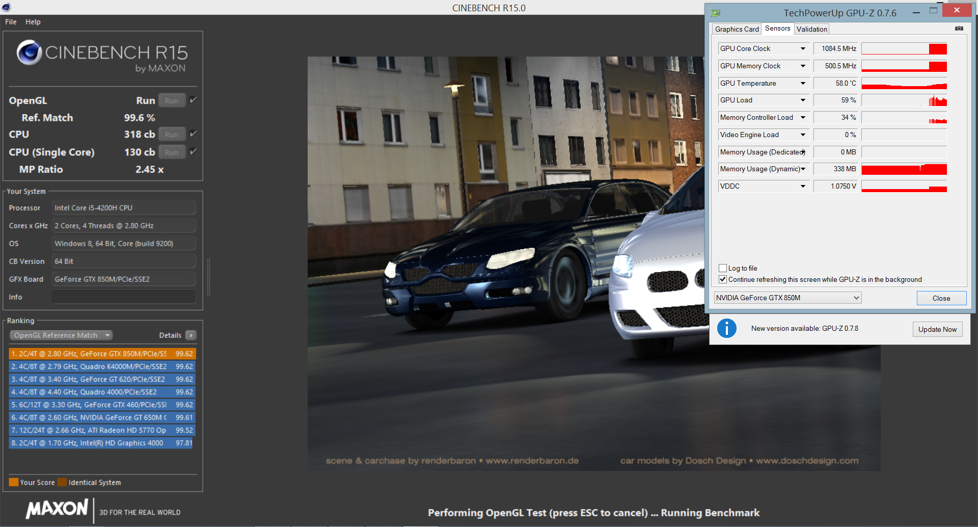 Die OpenGL-Tests absolviert die GTX 850 (DDR3) mit konstant 1.085 MHz (936 MHz Grundtakt zzgl. Boost). Dies bleibt auch im Akkubetrieb so (Profil Höchstleistung, Geforce erzwungen, Energiesparen deaktiviert), wobei dennoch das Resultat von 74 (Netz) auf 60 fps (Akku) fällt. Die Ergebnisse der CPU-Benchmarks bleiben im Akkubetrieb erhalten, es kommt also nicht zum Leistungseinbruch.