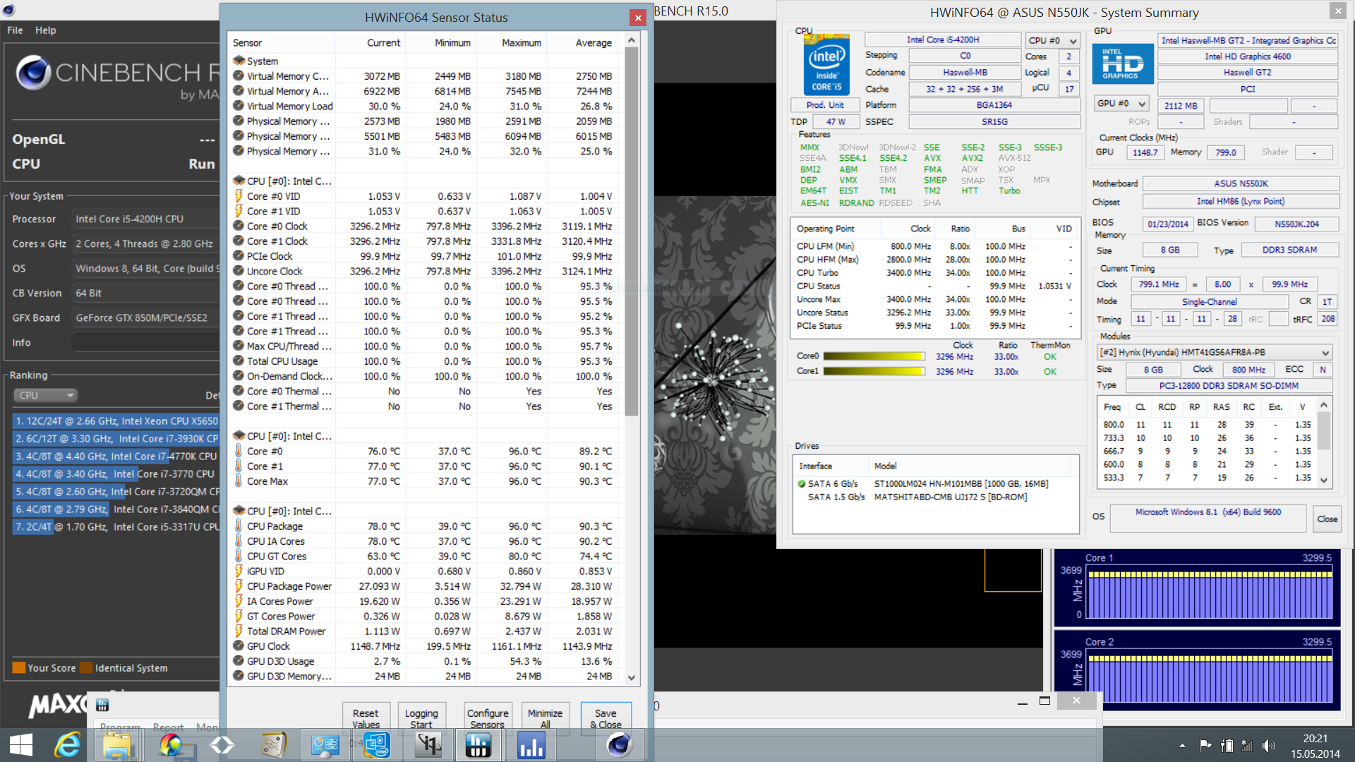 Der baugleiche Vorgänger N550JV-CN201H war mit dem i7 4700HQ bestückt, wir haben das Modell in die Vergleichschart gesetzt. Die i7-Variante im gleichen Chassis absolvierte die Single-Thread-Tests der Cinebench-Benchmarks mit 3,2 bis 3,3 GHz. Die Multi-Thread-Tests wurden mit 3,1 bis 3,2 GHz gerechnet. Das Kühlsystem wird scheinbar problemlos mit der Abwärme beider 47-Watt-Rechenkerne fertig. Wer mit einem i7 4700HQ liebäugelt, der bekommt zirka 30 % Mehrleistung (auch @Samsung 870Z5G). Aufpassen sollten Performance-Geeks bei der ULV-Version i7 4500U (Dual Core), die mit nur 15 Watt TDP 26 % langsamer rechnet.