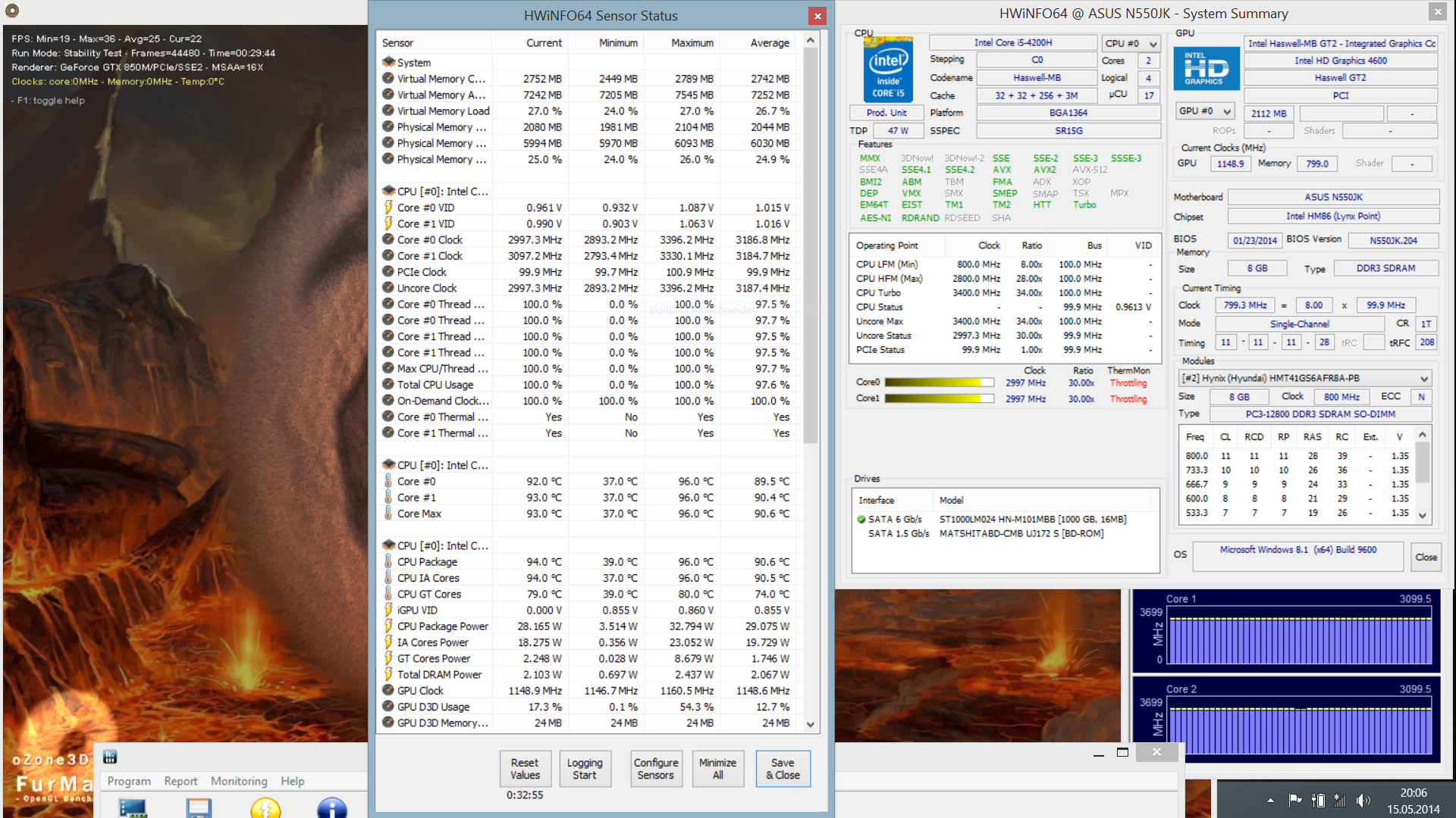 Den Stresstest am Netz bearbeitet das N550JK-CN109H vorbildlich mit 3,0 bis 3,2 GHz, es liegt also kein Throttling vor (nicht unter Standard-Takt). Sofern wir den Netzstecker ziehen, wird jedoch der CPU-Takt auf 800 MHz begrenzt, das ist auch bei Games der Fall. Die leichte Taktschwankung setzt sofort wieder auf konstant 3,3 GHz, wenn wir Furmark beenden (GPU-Stress). Leistungseinbußen durch thermisches Throttling sind also nicht in Sicht, das Dual-Kühlsystem schaffte es, trotz relativ hoher Raumtemperatur von 24 Grad die CPU auf 93 Grad zu halten.
