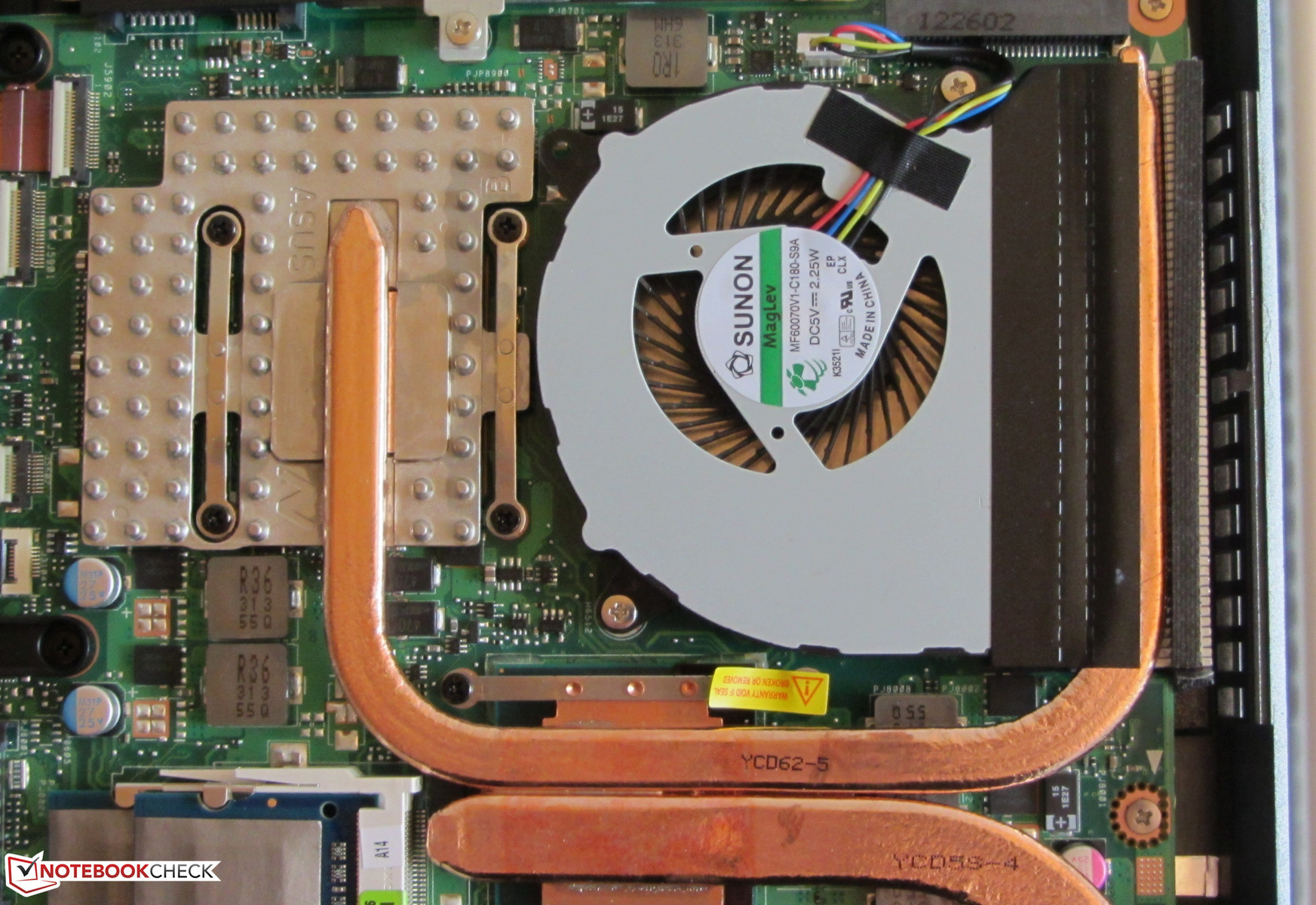 Die Geräuschemissionen des Doppellüfter-Systems (siehe Fotos rechte Spalte) halten sich in Grenzen, selbst unter hoher Last. Wenn der Nutzer Optimus zulässt und die GTX-Karte sich abschaltet, dann rauscht der Lüfter nur noch ganz leise. Allerdings messen wir dann das konstante Grundrauschen der Festplatte von 33,8 dB(A). Die Lüfter schalten sich also beide niemals ab, sie sind aber gemächliche Zeitgenossen. Bei Last drehen sie angenehm konstant, ohne heftige Sprünge zwischen den Umdrehungen. Games liegen etwa bei einem Pegel von 42 dB(A), der Stresstest wird nur minimal lauter.