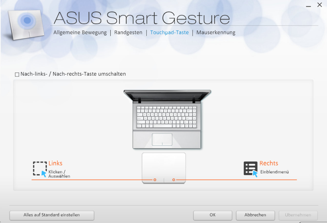 Einen überzeugenden Eindruck hat das als tastenloses Clickpad ausgeführte Touchpad hinterlassen. Die Oberfläche ist völlig glatt und somit arm an haptischem Feedback, und an den Rändern befinden sich überdurchschnittlich breite Bereiche, wo keine Berührungen mehr registriert werden. Außerdem kann der Mauszeiger unrealistisch schnellen Bewegungen nicht mehr folgen. Im praktischen Einsatz hat das alles kaum gestört, dafür durfte der Autor sich über eine einwandfreie Präzision und ein ausgezeichnetes Ansprechverhalten freuen. Drag & Drop gelang stets sicher, jedes Antippen wurde zuverlässig umgesetzt. Die angenehm kurzhubigen "Tasten" weisen einen für das Empfinden des Autors idealen Widerstand sowie einen knackigen Druckpunkt auf und quittieren ihre Betätigung mit einem dezenten akustischen Feedback. Es werden bis zu drei Berührungen gleichzeitig erkannt. Vorbildlich sind die umfangreichen, gut dokumentierten Konfigurationsmöglichkeiten im Asus Smart Gesture Menü ausgefallen.