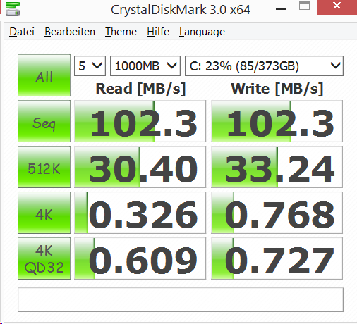 Ungewöhnlich: Statt eine Hybrid-Festplatte zu verbauen, kommt eine einzelne SSD mit 24 GB Kapazität als SSD-Cache für die konventionelle, ein TB fassende HGST Travelstar 5K1000 HTS541010A9E680 zum Einsatz. Unsere Tests beweisen, dass das Ergebnis das gleiche ist: Häufig genutzte Anwendungen werden auf die SSD kopiert und starten von dort schneller als von der HDD. Die 102 MB/s beim sequenziellen Lesen, die das Gespann im ersten Durchlauf des CrystalDiskMark 3 geschafft hat, sind solide, aber kein Spitzenwert. Derselbe Durchlauf weist eine Schwäche beim Einlesen kleiner, verteilter Datenblöcke (4k, z. B. OS- oder Programmstarts) aus. Der gemessene Wert liegt im Vergleich mit anderen Hybrid-Speichern am unteren Ende des Feldes, allerdings zeichnen sich Benchmarks von Massenspeichern dieser Art generell durch starke Streuungen aus und sind somit mit Vorsicht zu genießen.