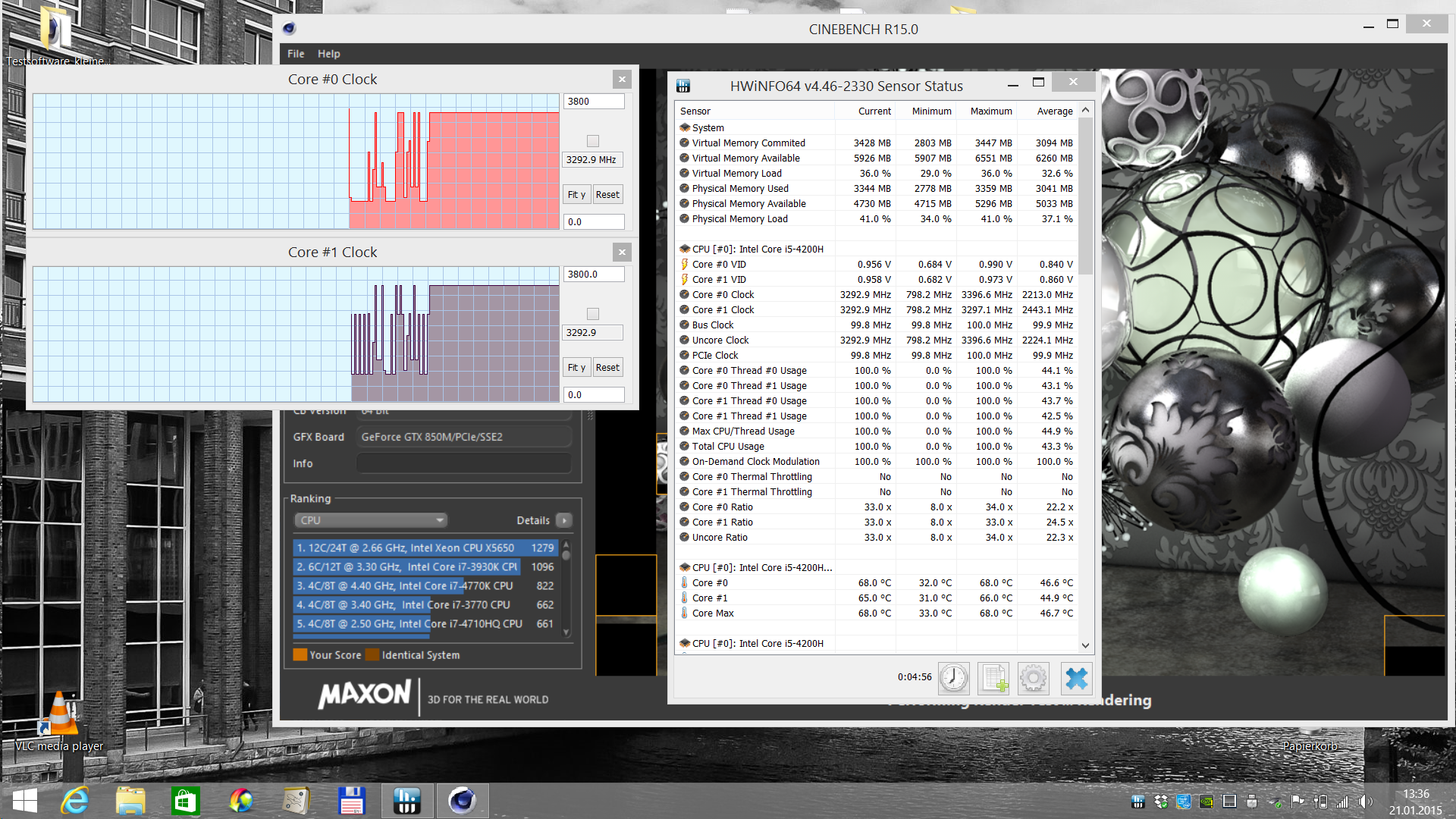 Die Performance reicht durchaus auch für anspruchsvolle Anwendungen aus, und auch die meisten aktuellen Spiele dürften kaum durch die CPU limitiert werden. Eine Ausnahme bildet stark parallelisierte Software, die deutlich von vier oder mehr physischen Kernen profitiert, was auch auf einige Games zutrifft. Integriert ist die recht potente On-Chip-GPU Intel HD 4600, die sich um eher anspruchslose (2D-)Grafikberechnungen kümmert, während aufwändiges 3D-Rendering dank Optimus Technologie automatisch auf der viel leistungsfähigeren, aber auch stromhungrigeren Nvidia GeForce GTX 850M durchgeführt wird. Vergleicht man die Leistung schon bisher getesteter Notebooks mit dem gleichen Prozessor in den Multi- und Single-Core-Tests der Cinebenches R11.5 und R15 mit der des Testgerätes, ergeben sich nur minimale Unterschiede, die im Bereich der Messungenauigkeit liegen. Das bestätigt unsere Beobachtungen der Kerntakte in denselben Tests, die eine perfekte Ausnutzung der Turbostufen zeigen. Im Akkubetrieb ergaben sich keine Unterschiede.