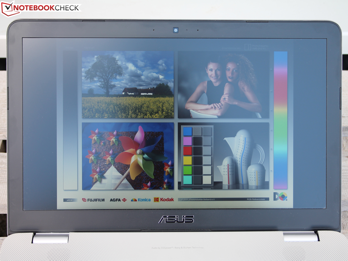 Wir haben das TN-Display im Auslieferungszustand mit dem Fotospektrometer und CalMAN vermessen. Die starke Abweichung der Farben vom sRGB-Zielzustand, aufgezeigt durch einen hohen DeltaE von 11-12, spricht eher für ein Low-Cost-Panel. Das N551JK hat nicht nur eine deutlich bessere Farbwiedergabe (69 % AdobeRGB), es leuchtet auch 100 cd/m² heller. Ein mehr als deutlicher Blaustich trübt im Auslieferungszustand weiterhin die Stimmung. Dieser könnte durch Kalibration abgemildert werden, der Blaustich verschwindet aber nicht vollständig.
