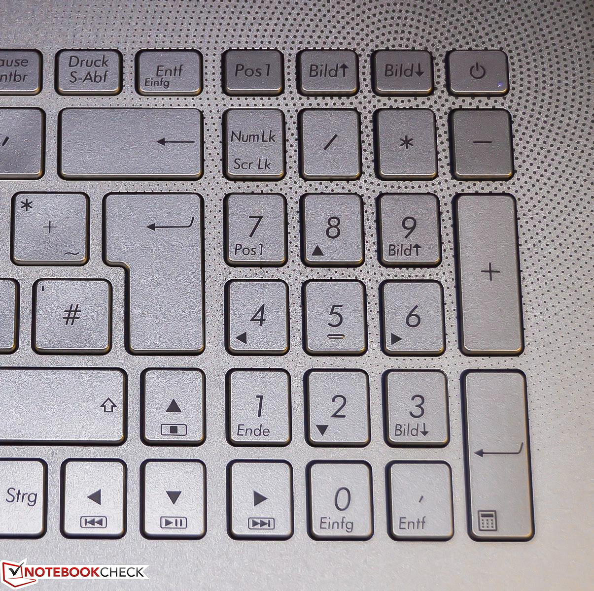 Auch hier treffen wir auf eine Insel-Tastatur (Chiclet-Tastatur). Alle Tasten, einschließlich der Funtionstasten, sowie der um 1 cm in der Breite verkleinerte Nummernblock, fallen flach aus. Den On-/Off-Button hat Asus wieder oben rechts in die Tastatur integriert. Play, stop, forward & backward befindet sich auf den Pfeiltasten, alles Andere ist dort, wo man es vermutet.