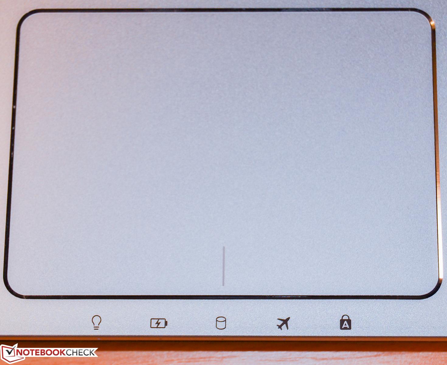 Einen überzeugenden Eindruck hat das als tastenloses Clickpad ausgeführte Touchpad hinterlassen. Die Oberfläche ist völlig glatt und bietet somit einen hervorragenden haptischen Kontrast zu den sauber gefrästen Aluminium-Rändern. An allen Rändern des Touchpad befinden sich 4mm breite Bereiche, die keine Berührungen mehr registrieren. Dank überdurchschnittlicher Touchpad-Größe, herausragendem Ansprechverhalten, gepaart mit guter Präzision, konnte der Autor ohne Schwierigkeiten auf eine externe Maus verzichten. Drag & Drop gelang jederzeit sicher. Die angenehm kurzhubigen "Tasten", weisen einen für das Empfinden des Autors idealen Widerstand sowie einen knackigen Druckpunkt auf und quittieren jede Betätigung, mit einem dezenten akustischen Feedback. Es werden bis zu vier Berührungen gleichzeitig erkannt. Asus Smart Gesture erlaubt die komfortable Konfiguration von Gesten mit bis zu vier Fingern.