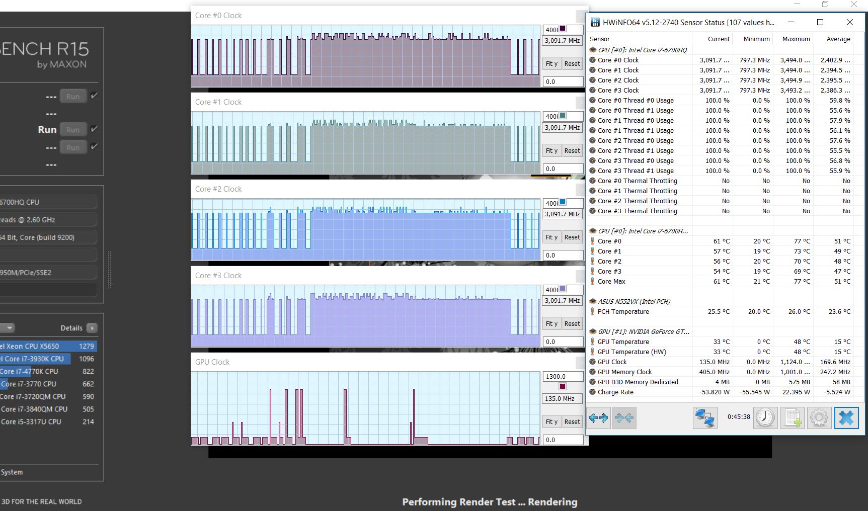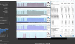 Der Cinebench R15 erzeugt eine halbwegs realistische CPU-Last. Wir haben ihn in der Schleife laufen lassen und festgestellt, dass das Testgerät im Akkubetrieb bei unter 45% Ladung zu starkem Throttling neigt (gleichmäßige Sprünge von 800 zu 3.091 Mhz, siehe Bild). Der Punktestand erreicht dann nur noch die halbe Punktzahl. Leider gilt ein ähnliches Verhalten für die Grafikkarte (siehe Gaming Performance). Positiv anzumerken ist, dass bei einstecken des Netzkabels sofort die volle Leistung erbracht wird. Sobald der Akku 45% Ladung erreicht hat, ist die Leistung des Cinebench R15 im Akku- wie auch im Netzbetrieb gleich.