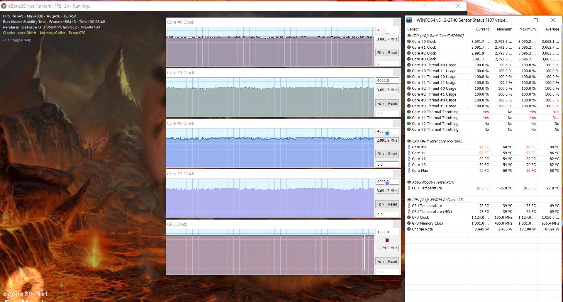 Den Stresstest Prime95 Large FFTs + Furmark für mindestens eine Stunde (= 100% CPU-Last + 100% GPU-Last gleichzeitig) durchläuft die CPU des Testgeräts Asus N552VX-FY103T im Netzbetrieb mit fast durchgängig vollem Turbo-Boost (4 Cores, 3,1 Ghz), ein Throttling (fallen auf unter 2,6 Ghz Basistakt) tritt nicht auf. Der Grafikkern hält durchgängig die volle Geschwindigkeit von 1.124 Mhz. Im Akkubetrieb (Akkuladung > 60%) arbeitet im schnellen Wechsel erst CPU, dann GPU mit voller Geschwindigkeit. Fällt die Akkuladung < 60% verweilt der Grafikkern auf 281 Mhz (und macht nur noch sehr selten Sprünge zwischen 600 und 1.124 Mhz), die CPU arbeitet derweil mit 800 Mhz (und macht auch hier nur sehr selten Sprünge auf 3,1 Ghz).