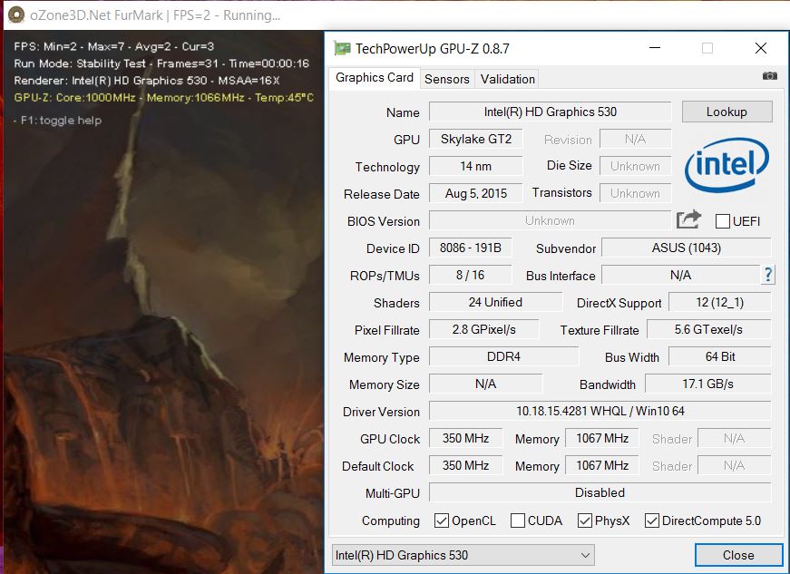 Der GPU Stresstest, Furmark (Multi GPU), erzeugt eine hohe GPU-Last. Die Ergebnisse lauten: Akkuladung < 45% = starkes Throttling (gleichmäßige Sprünge von 600 zu 1.124 Mhz), Akkuladung > 45% = kein Throttling. Die Ergebnisse sind demnach ähnlich wie die im Cinebench R15 Test.