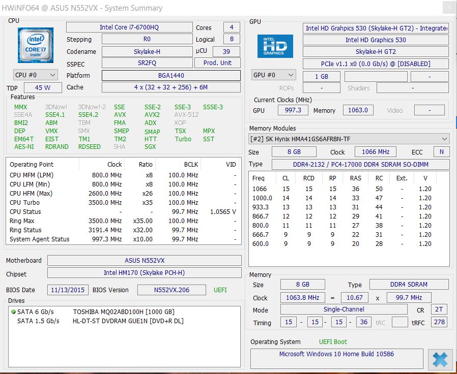 Mit einem Intel Core i7-6700HQ (Skylake) Vierkernprozessor verfügt das Asus N552VX-FY103T über mehr als genug Rechenleistung für alle gängigen Anwendungsszenarien. Es handelt sich hierbei nicht um einen ULV-Prozessor (TDP: 15 Watt), sondern um einen herkömmlichen Mobilprozessor (TDP: 45 Watt). Die CPU arbeitet mit einer Basisgeschwindigkeit von 2,6 GHz. Per Turbo kann der Takt auf 3,1 GHz (vier Kerne), 3,3 GHz (zwei Kerne) bzw. 3,5 GHz (ein Kern) gesteigert werden. Vom Turbo wird auch reichlich Gebrauch gemacht aber leider nur im Netzbetrieb.