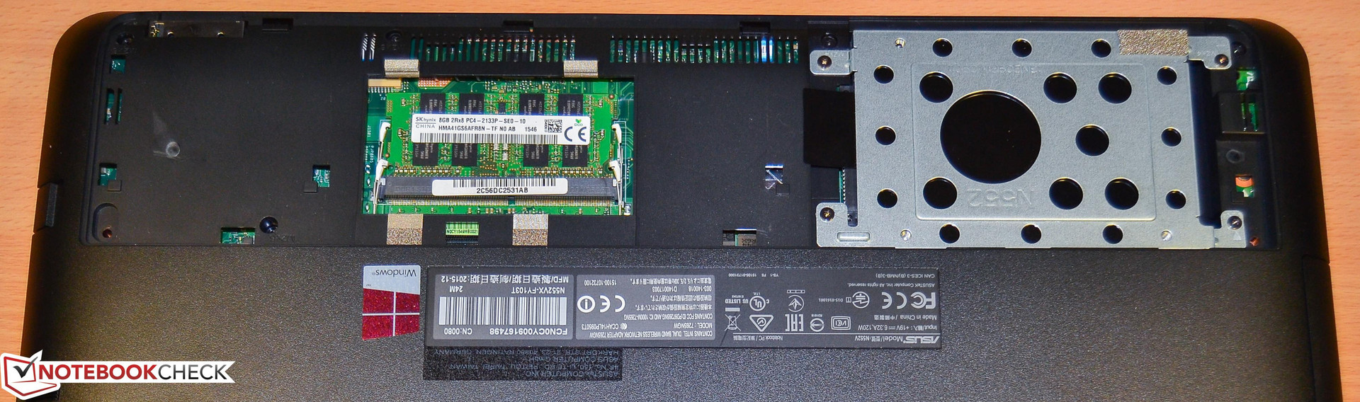 Ein auf die traditionelle Art wechselbarer Akku und eine Wartungsklappe sind leider auch bei leistungsstarken, größeren Notebooks wie dem Testgerät keine Selbstverständlichkeit mehr. Asus liefert zumindest eine Wartungsklappe, diese ist mit zwei Schrauben gesichert, einfach zu öffnen und bietet Zugang zu Festplatte und den zwei RAM-Bänken, nicht aber zum Lüfter und leider auch nicht zum freien M.2 SSD Steckplatz (22x80mm).