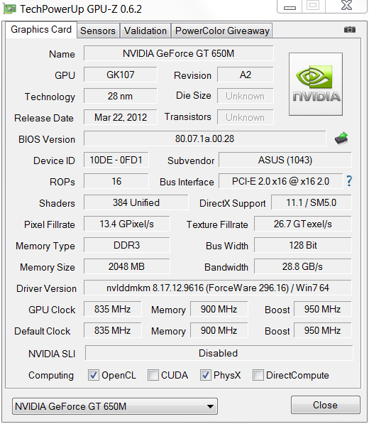 Wenn die Grafikleistung der integrierten GPU einmal nicht ausreicht, kann die dedizierte Grafikkarte von Nvidia, die GeForce GT 650M die Grafikberechnungen übernehmen (Optimus). Die Notebookhersteller können den Kerntakt bei ausreichender Kühlung auch oberhalb von 735 MHz wählen. Hier setzt Asus bei unserem Testgerät einen 100 MHz höheren Kerntakt fest und taktet somit die GPU mit 835 MHz.
