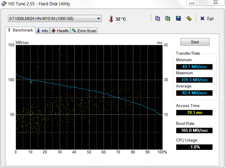 Die Seagate ST1000LM024 mit 1 TB dreht nur mit einer Geschwindigkeit von 5400 U/min und ist damit leiser als die meist schnelleren Konkurrenten mit 7200 U/min. Bei den Transferraten schafft sie jedoch für eine 5400er HDD ein gutes Ergebnis. Mit durchschnittlich 82,4 MB/s gehört sie zu den flotteren ihrer Zunft, bleibt allerdings hinter schnellen 7200er-Platten zurück. Die Zugriffszeit von 19,1 ms ist mittelmäßig.