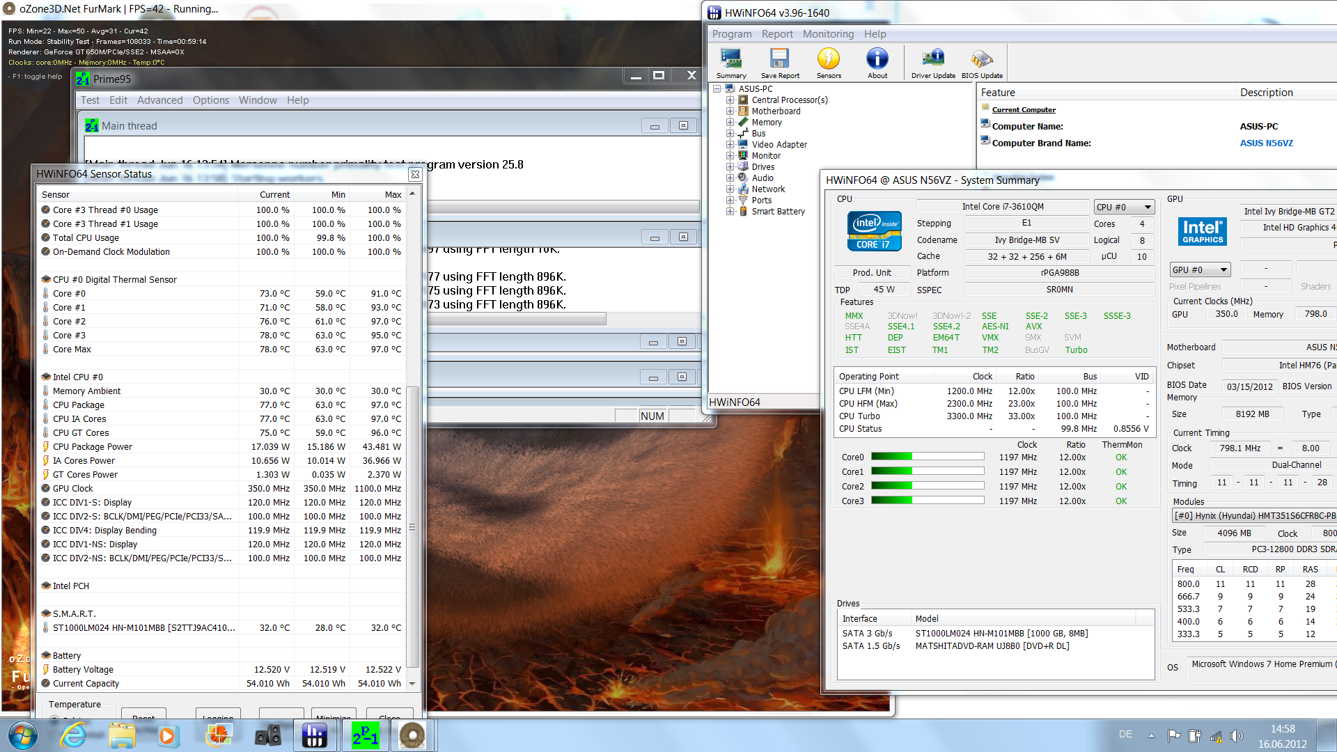 Das von uns parallel getestete Pre-Sample des Asus N56VM mit stärkerem Core i7-3720QM und der Nvidia GeForce GT 630M zeigte jedoch im Test keinerlei Throttling. Nach anfänglichen erwarteten Turbo Frequenzen von bis zu 3,6 GHz pendelte sich die CPU danach bei normalen 2,6 GHz ein (bei angezeigten 85-87°C Kerntemperaturen in HWInfo64). Auch die GPU erreichte laut FurMark die maximale Taktfrequenz und blieb mit 73°C im Rahmen. Auch ein im Anschluss ausgeführter Cinebench R11.5 erreichte ein erwartetes Ergebnis von 5,9 Punkten (unteres Ende der 3720QM durch wenig Turbo Boost Einsatz wegen der Resthitze). Bei 24,5°C Umgebungstemperatur, sollte das N56VM dadurch allen Belastungen gewachsen sein, ohne zurücktakten zu müssen.