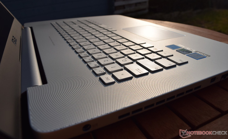 Bei der Tastatur setzt Asus auf das gleiche Design wie auch schon beim Vorgänger, dem Asus N751JX-T4056H. Der nicht separierte Power Button befindet sich immer noch ganz rechts oben. Damit bleibt auch die Gefahr bestehen, beim schnellen Tippen diese Taste ungewollt zu betätigen. Je nachdem, wie die Energieoptionen konfiguriert sind, kann es dann vorkommen, dass das System ungewollt in den Standby-Modus befördert wird.
