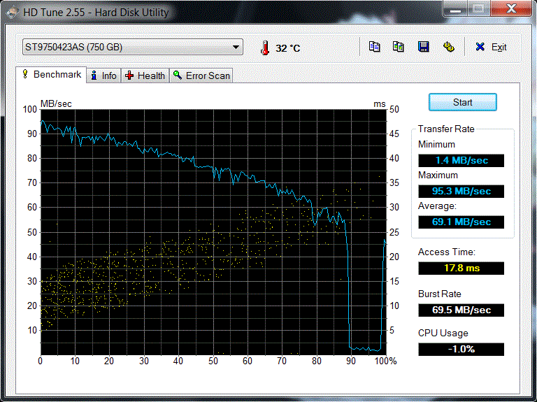 Unter der Haube tummeln sich zwei 750 GByte große HDDs von Seagate (kein RAID), welche auf die Bezeichnung ST9750423AS hören und mit 5400 U/Min laufen. Die Leistung der System-Festplatte haben wir mit den Tools HDTune und CrystalDiskMark gemessen. Eine sequentielle Lese- und Schreibrate von 87 bzw. 82 MB/Sek ist ordentlich, aber nicht überragend. Die Zugriffszeit offenbart sich mit 17.8 ms ebenfalls als durchschnittlich.