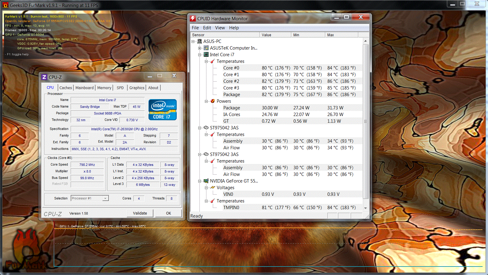 Die Komponenten erreichen natürlich weitaus höhere Temperaturen. In unserem Stresstest (Furmark & Prime) pendelten sich Grafikkarte und Prozessor auf passable 80 °C ein. Alles schön und gut, würde Intels Core i7-2630QM unter Volllast nicht auf 800 MHz drosseln. Bei den praxisnahen Spieletests hatten wir aufgrund temporärer Ruckler zwar auch stellenweise das Gefühl, dass der Prozessor throttelt, die Frameverläufe und Benchmarkergebnisse können diese Vermutung jedoch nicht untermauern. Falls sich Ihr Gerät beim Zocken heruntertakten sollte, hilft vermutlich das Tool "Throttlestop".