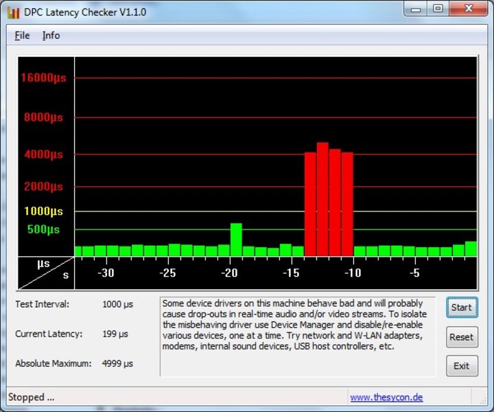 Vorsicht ist beim Anschluss von externen Geräten geboten. Zwar bleiben die DPC Latenzen zumeist im grünen Bereich, doch gelegentliche Ausreißer auf bis zu etwa 5000 µs können Probleme mit der Synchronisation externer Geräte, etwa Soundknacken beim Anschluss externer Audiokarten, mit sich bringen. Hier sollte man durch selektives Deaktivieren einzelner Treiber den Verursacher herausfinden, und kann dann eventuell durch ein Treiberupdate das Problem in den Griff bekommen.