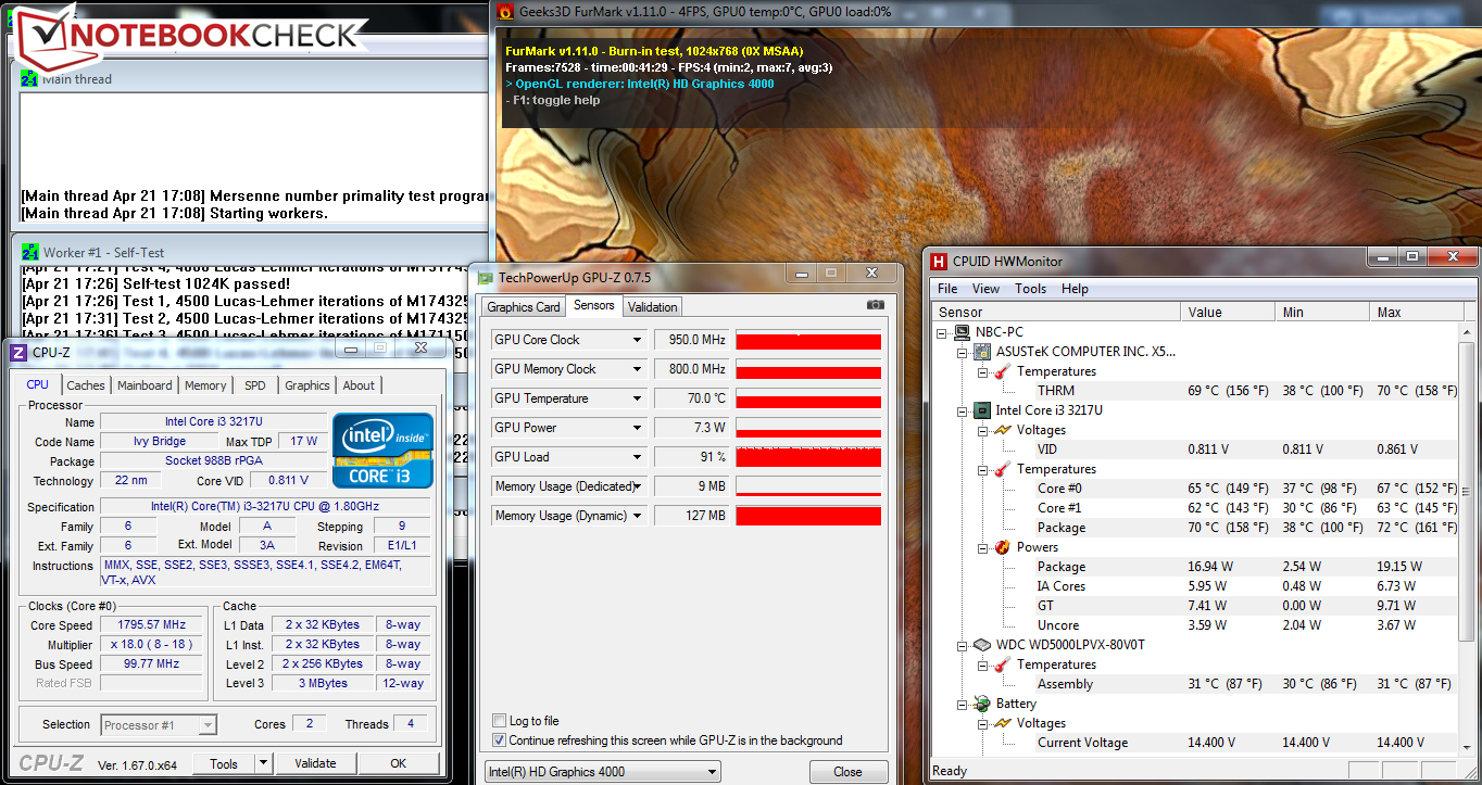 Den Stresstest (Prime95 und Furmark arbeiten für mindestens eine Stunde) durchläuft die CPU des P550CA sowohl im Netz- als auch im Akkubetrieb mit voller Geschwindigkeit (1,8 GHz). Die GPU hingegen arbeitet mit 900 bis 1.000 MHz (Netzbetrieb) bzw. 350 MHz (Akkubetrieb). Die CPU-Temperatur hat sich während des Stresstests (Netzbetrieb) bei etwa 70 Grad Celsius eingependelt.