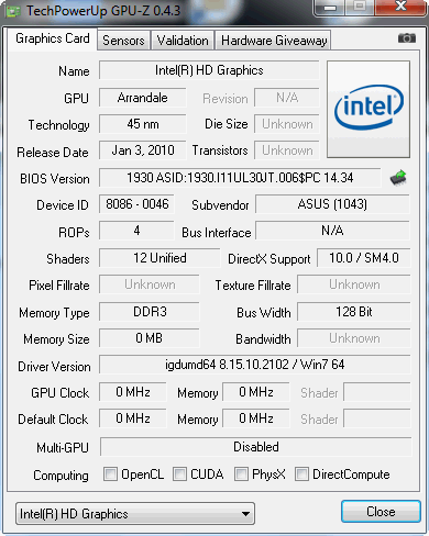 Die Nvidia GeForce 310M kann auf 1.024 MB DDR3 Videospeicher zugreifen. Es ist eine Einsteiger-GPU, die DirectX-10.1 Effekte aber kein PhysX kann. Die Leistung stimmt mit der GeForce G 210M überein (identischer Kern Takt von 625 MHz). Den Speichertakt hat Asus auf 667 MHz herunter gesetzt (typisch: 800 MHz).