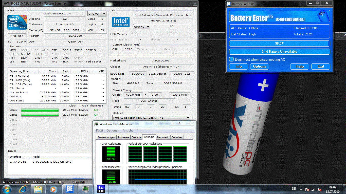 Wer eine starke Akkulaufzeit will, ohne dabei auf Leistung zu verzichten, der sollte sich das Asus PL30JT-RO030X für derzeit 890 Euro näher ansehen. Mit seinem Intel Core i5-520UM Ultra Low Voltage Prozessor stehen alle positiven Merkmale der neuen Core i5 Generation zur Verfügung (Intel HD integriert, Turbo Boost, Hyper Threading). Die Standard-Taktung von 1.06 GHz hört sich gering an. Doch durch Turbo Boost und zusätzlich durch die hauseigene Asus-Übertaktung werden bis zu 2.12 GHz möglich (Turbo-33 + Turbo Boost).