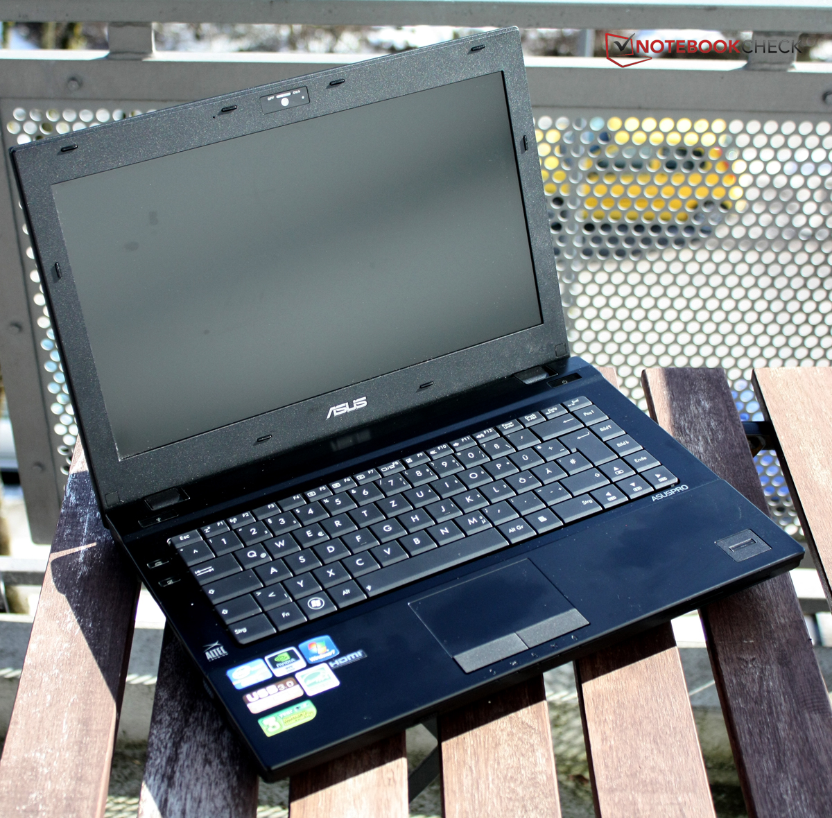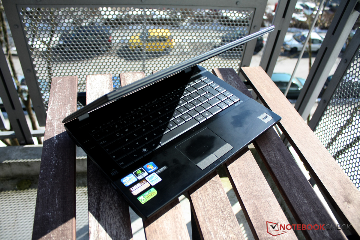 Im Außengebrauch spielen der sehr helle Monitor und die matte Beschichtung gut zusammen: Auch wenn an sehr hellen Tagen das Arbeiten im direkten Sonnenlicht nicht möglich ist, so sind schattige Plätzchen und helle Innenräume durchaus ein mögliches Arbeitsumfeld für das Asus Pro B43V. Störende Spiegelungen treten dank der matten Beschichtung hier nicht auf.