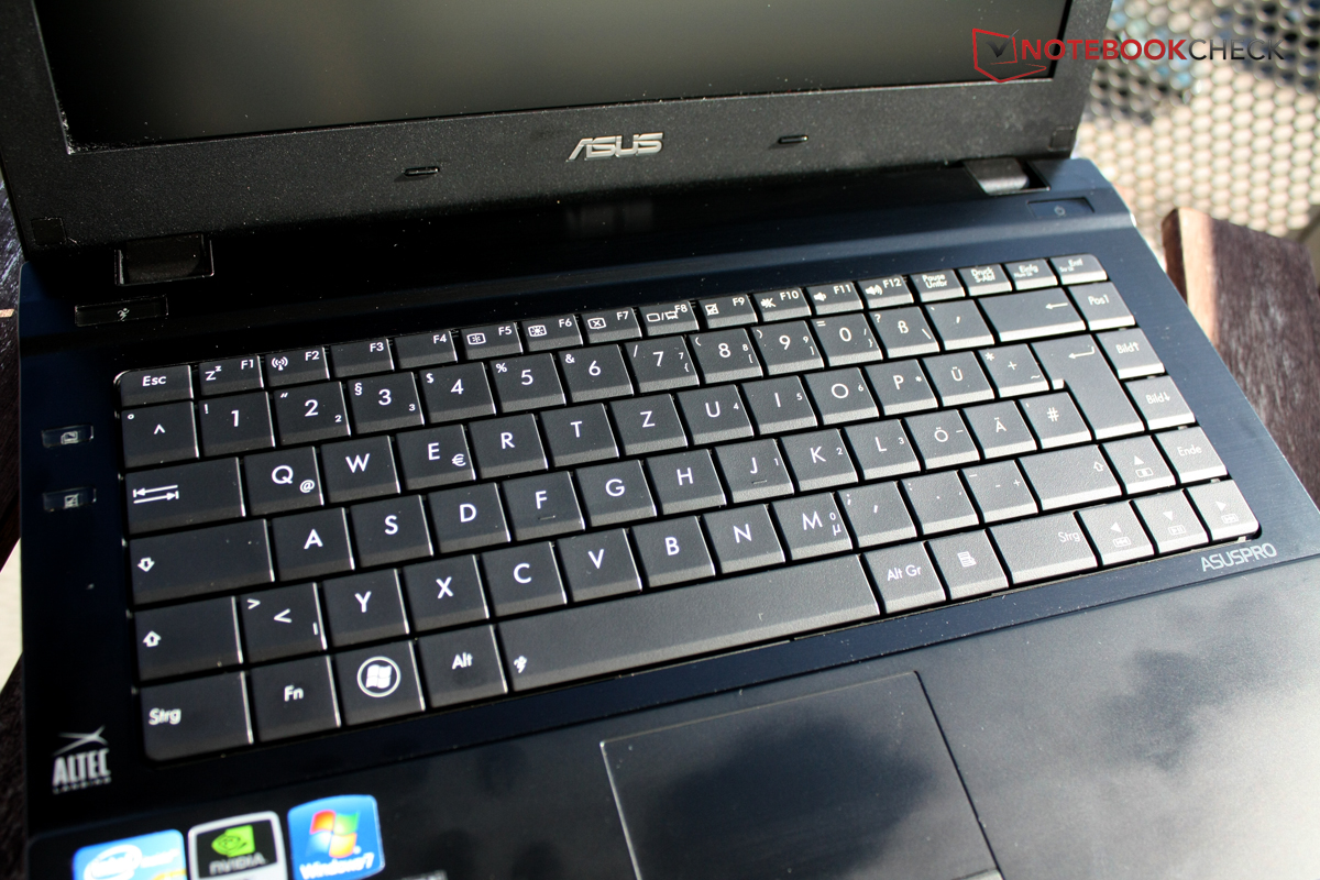 Die unbeleuchtete Tastatur des Asus Pro B43V hat ganz besonders geformte Tasten: rechteckig, aber vorne abgeschrägt. Das sieht schick aus und hilft, die einzelnen, Tasten zu unterscheiden, auch ohne hinzusehen. Der Tastenhub ist recht lang und die Tasten bieten nur einen geringen Widerstand. Durch das Design der Tastatur mit nur sehr geringen Abständen zwischen den Tasten und den langen Hub bleibt man beim schnellen Schreiben schon mal an der Nachbartaste hängen. Das machen andere Hersteller besser. Ansonsten funktionieren die durchgängig sehr großzügigen Tasten aber zuverlässig und es lässt sich schnell schreiben.