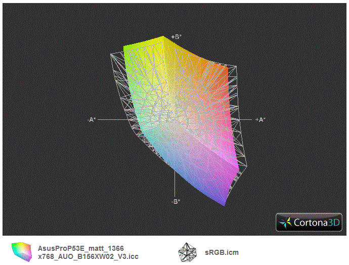 Asus setzt ein 15.6-Zoll-WXGA-Panel mit einer nativen Auflösung von 1.366 x 768 Pixeln ein. Die 16:9-Anzeige vom Hersteller AUO (B156XW02 V3) wurde entspiegelt, weshalb es keine störenden Reflexionen durch Gegenlicht gibt. Der Kontrast ist mit 173:1 sehr gering, aber typisch für Office-Laptops. Der gemessene Schwarzwert liegt bei 0.96 cd/m². Auswirkungen hat der niedrige Kontrast auf die Wirkung von Farben und auf den Hell-dunkel-Unterschied. Schwarz ist nicht in tiefschwarz, es bleibt immer ein gräulicher Schimmer. Farben sind nicht knackig und leuchtend, sondern eher fahl und blass.