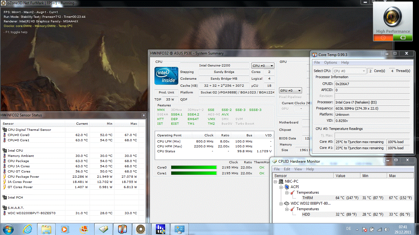 Der PCMark Vantage ermittelt einen Score von 4.810 Punkten. Das liegt deutlich unter i5-2430M-Systemen vom Schlage Dell Inspiron 14z (N411z) oder Fujitsu LifeBook E751 vPro/UMTS: 6.800 Punkte (+41 %). Diese sind ebenfalls nur mit einer HD 3000 und einer HDD ausgerüstet, was Rückschlüsse auf die i5-Variante des P53E zulässt. Der PCMark 7 liefert ein sehr ähnliches Bild ab: Obige zwei Geräte sind 28 % schneller als unser Testgerät mit seinen 1.768 Punkten.