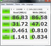 Der Crystal Disk Mark 3.0 bringt es auf 87 MB/s. Dieser Durchsatz befindet sich bereits am oberen Ende der 5400-RPM-HDDs (Mittelfeld der 7.200 U/Min HDDs). Weitere Vergleichsdaten finden Sie in der HDD/SSD Benchmarktabelle in der FAQ-Sektion.