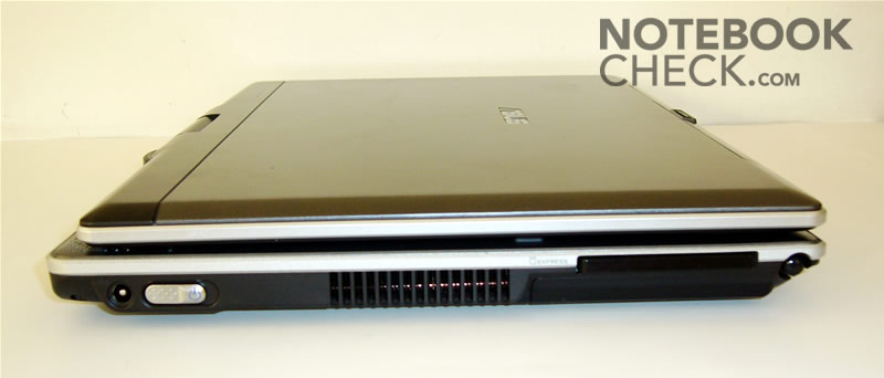 An der linken Geräteseite findet man im hinteren Bereich den Netzanschluss, im vorderen Bereich einen Expresscard Slot sowie die in einem Schacht versteckten TabletPC Pen. Ziemlich genau mittig an dieser Seite ist der Lüfter platziert.