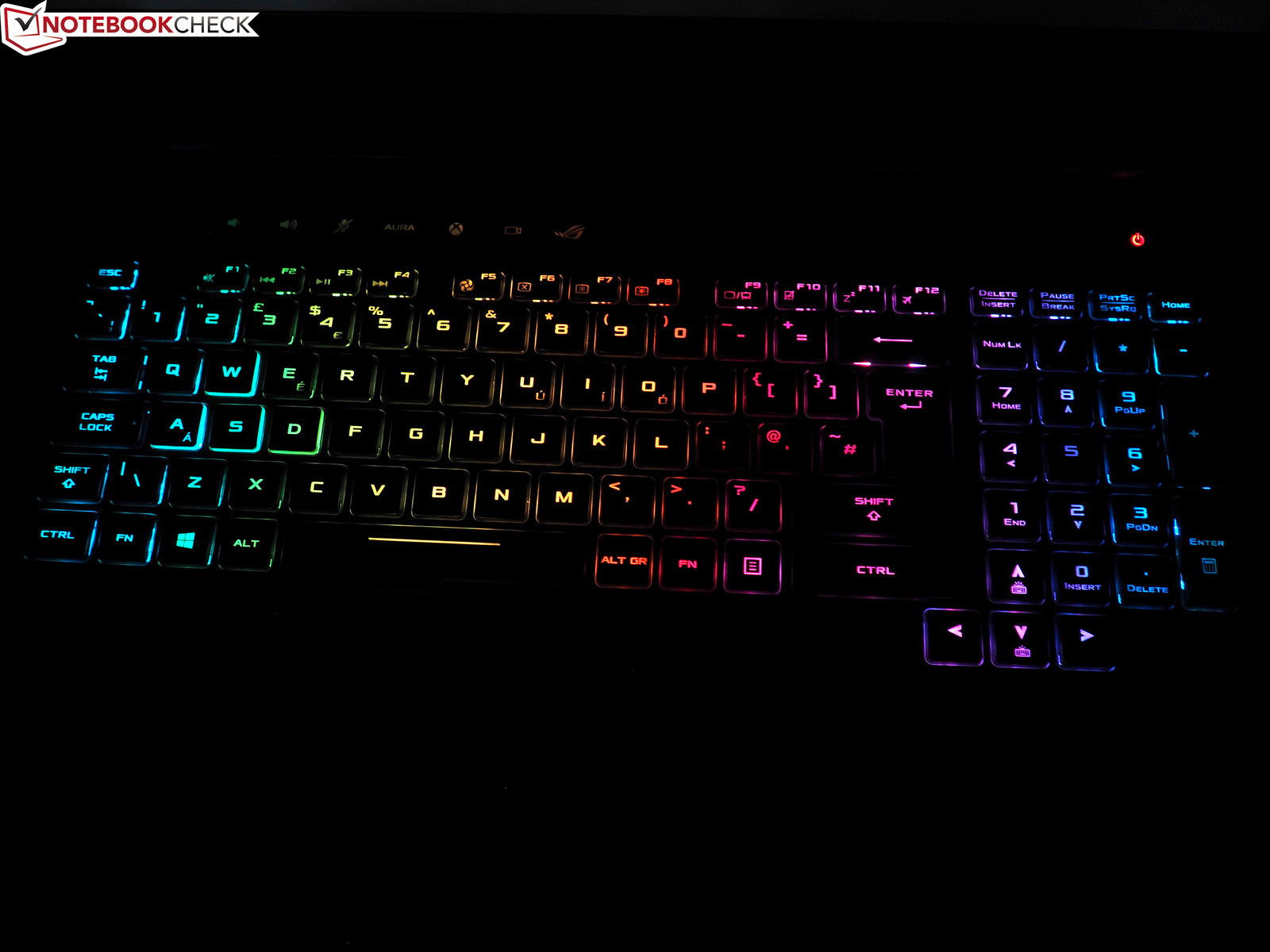 Beleuchtungsfans kommen beim ROG 703 definitiv auf ihre Kosten. Wie es sich für ein aktuelles Gaming-Notebook gehört, kann die Tastatur mit einer mehrstufigen und erfreulich hellen RGB-Beleuchtung aufwarten (inklusive diverser Modi). Die Qualität des Keyboards bewegt sich auf einem hohen bis sehr hohen Level. Während sich die Tasten beim G752 und G701 etwas schwammig anfühlen, besticht das Chimera durch ein sehr knackiges Feedback, welches Erinnerungen an das mechanische Keyboard des GT75VR weckt. Der verhältnismäßig hohe Tastenhub und das laute Tippgeräusch scheinen ebenfalls vom MSI Pendant inspiriert zu sein.