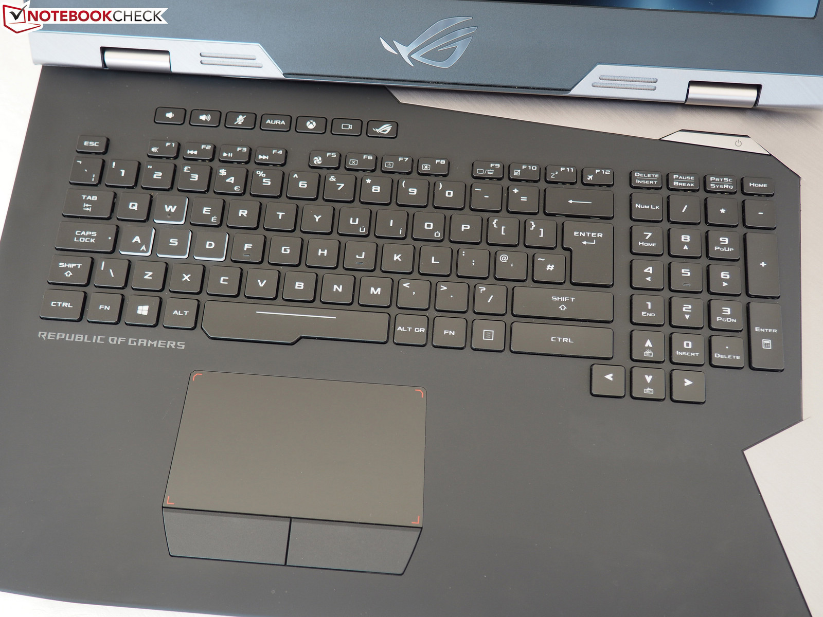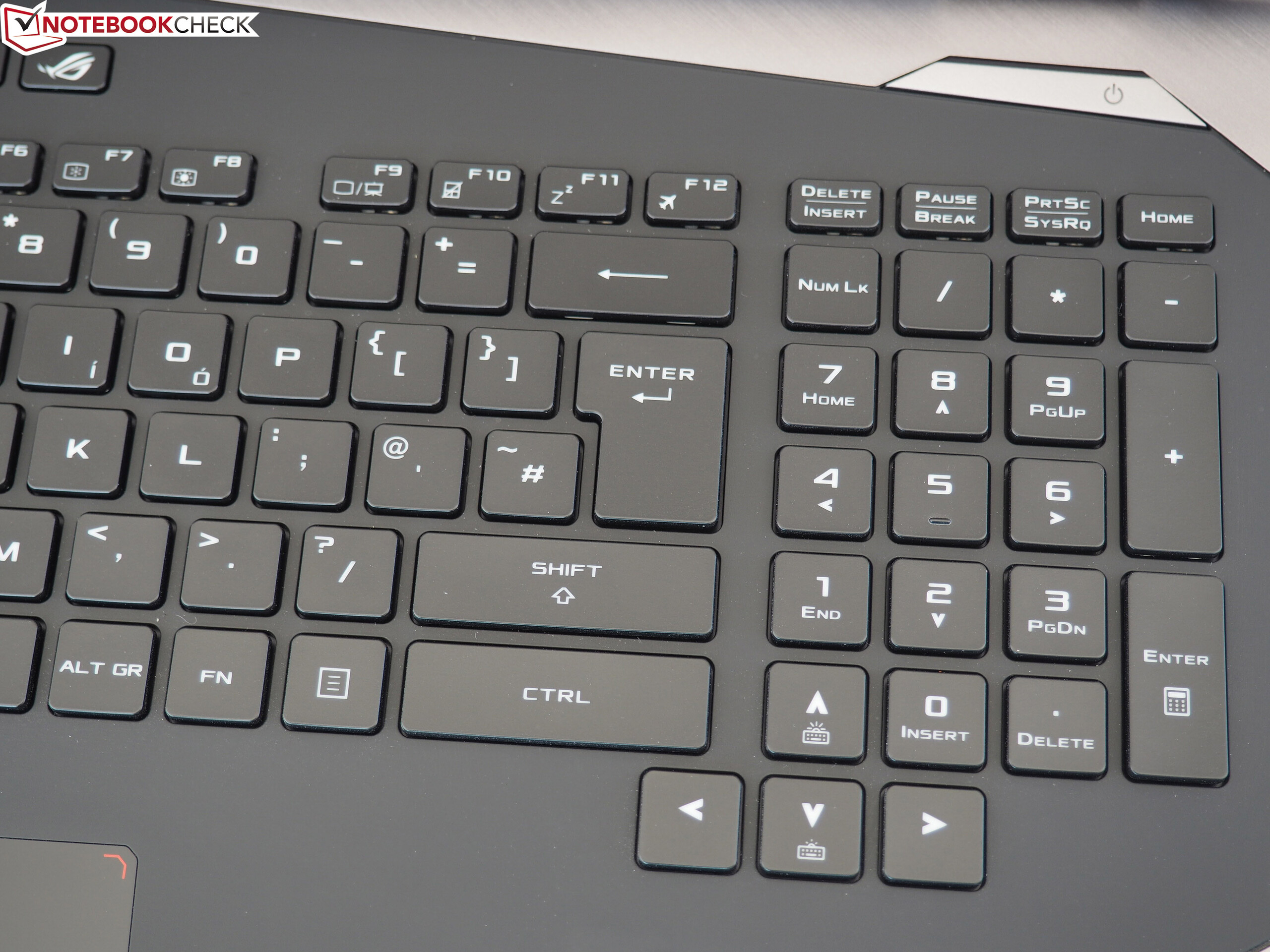 Beim Layout beschreitet Asus zum Glück andere Wege. Das G703 kommt hier ohne große Experimente aus und hält sich weitestgehend an den Standard. Vorteile im Vergleich zum GT75VR sind der vier- statt dreispaltige Nummernblock und die sinnvoller getrennte bzw. organisierte F-Reihe. Die Richtungspfeile ragen zudem in das Ziffernfeld und nicht in den Hauptblock hinein. Pluspunkte gibt es auch für die praktischen Sondertasten oberhalb des Keyboards. Mit diesen lässt sich beispielsweise die Lautstärke regeln und das Mikrofon deaktivieren.