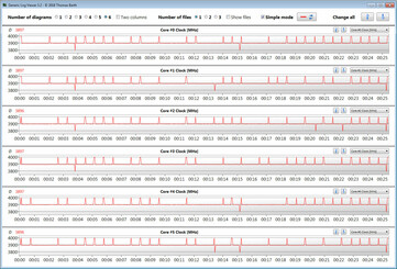 Die Multi-Thread-Tests der Cinebench-Benchmarks bearbeitet der Prozessor mit 3,9 GHz. Die Single-Thread-Tests werden mit 3,9 bis 4,1 GHz durchlaufen. Soweit das Verhalten im Netzbetrieb. Im Akkubetrieb geht die CPU mit 800 MHz zu Werke.