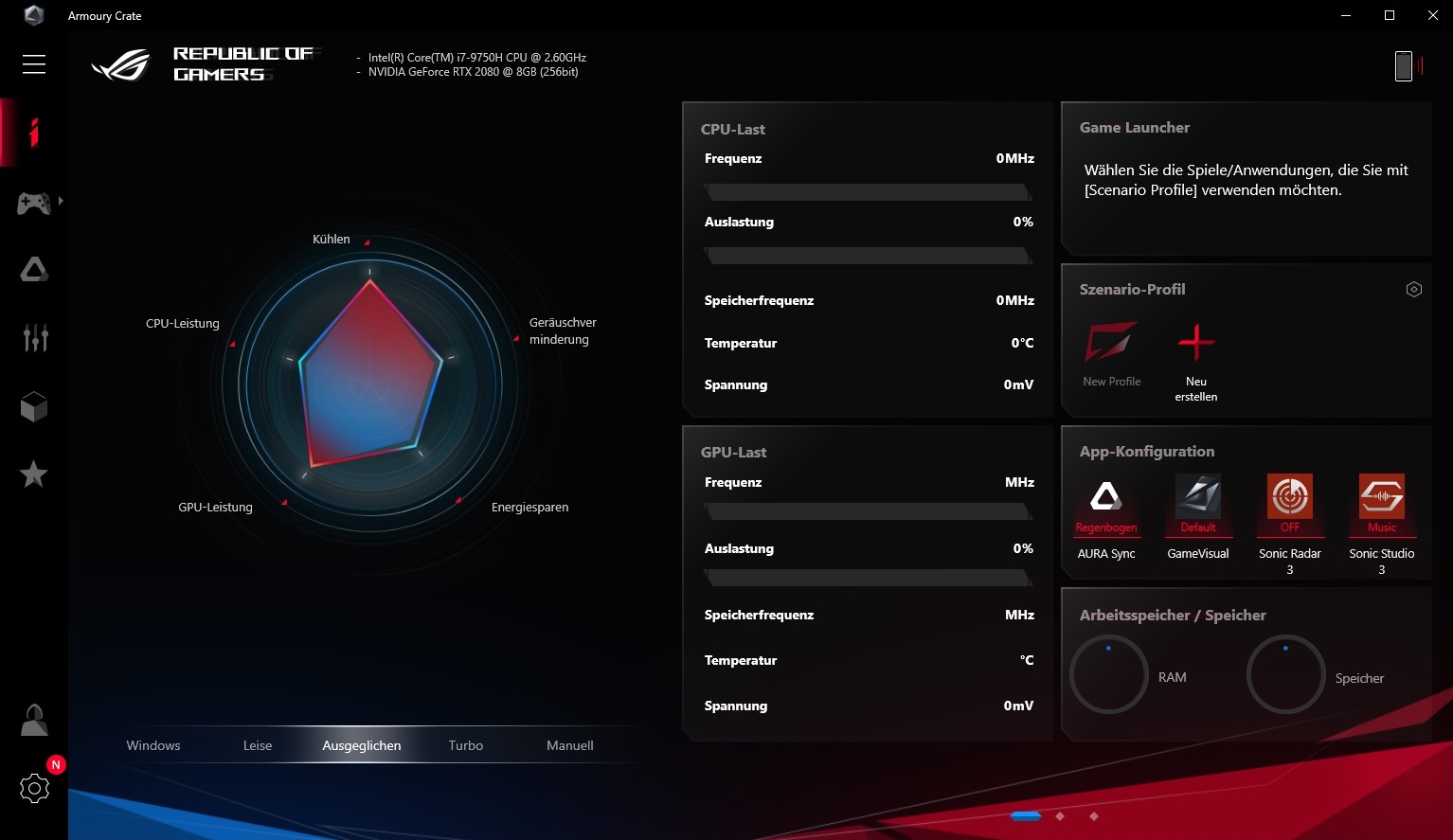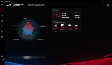 Das vorinstallierte Tool Armoury Crate bietet die Möglichkeit Einfluss auf diverse Systemeinstellungen zu nehmen. Unsere Messungen wurden allesamt mit dem Leistungsmodus Ausgeglichen (ist bei der Auslieferung aktiv) und dem GPU-Modus Optimus durchgeführt. Letzterer nutzt statt G-Sync Nvidias bekannte Grafikumschaltung, was für einen geringeren Energiebedarf und deutlich bessere Akkulaufzeiten sorgt.