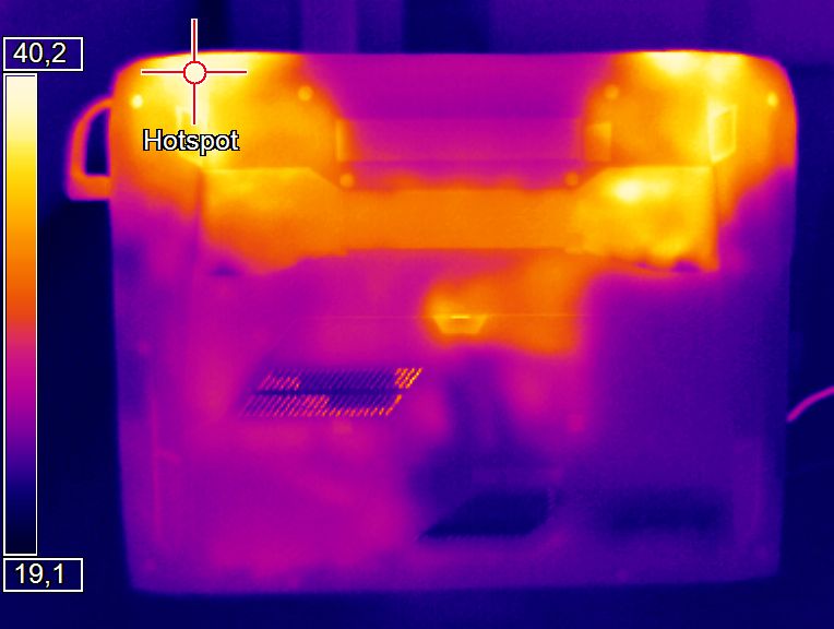 (+) Auf der Unterseite messen wir eine maximalen Wert von 39.3 °C (im Vergleich zum Durchschnitt von 43.3 °C).