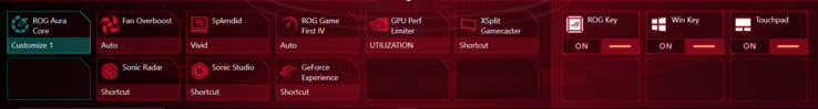 Asus hat seine eigene Software "ROG Gaming Center" inkludiert - ein wichtiger Bestandteil der ROG-Serie. Dieses Programm bietet einen einfachen Systemmonitor für CPU- und GPU- Taktfrequenzen und Temperaturen, der auch die Menge freier und aktuell verwendeter Speicherkapazität anzeigt. Zusätzlich sind auch die anderen üblichen Programme installiert. Dazu gehören Aura Core, welches für das Einstellen der 4-Zonen-RGB-Tastatur-Hintergrund-Beleuchtung gedacht ist, und ROG Gamefirst IV, welches Netzwerkverbindungen anderer Programme überprüft und priorisiert. Die installierte Software kann sehr hilfreich sein, hält sich aber ansonsten im Hintergrund.